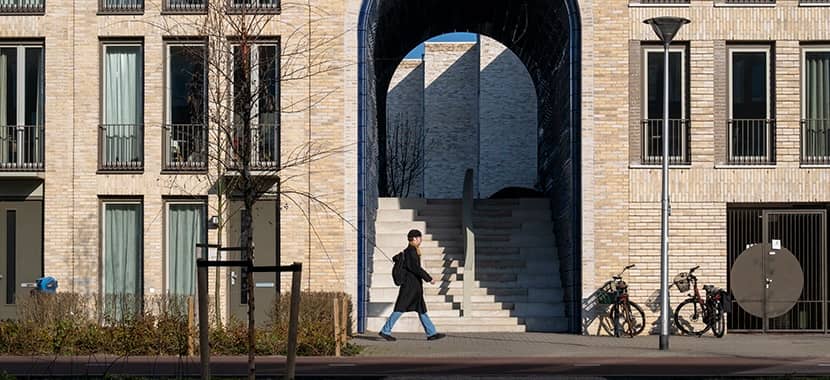 Toch kwamen ook marktpartijen met verrassende projecten over de brug. In deelgebied Abtswoudse Hof – dat vanwege de ligging nabij Delft-Zuid een modernistisch karakter heeft – spreekt The Family tot de verbeelding. Het bouwblok beschikt over tal van collectieve ruimtes: een ontmoetingsplek op de begane grond, een veilige speelplek voor kinderen op de eerste verdieping en hangplekken voor tieners op het platte dak. Ook De Poortmeesters is de moeite van een bezoek waard. Al is het maar vanwege de prachtige toegangspoort, bekleed met blauwe 3D-geprinte tegels. De trappen leiden naar een duinachtige binnentuin op het dak van een parkeergarage. De sfeer is informeel, zonder nadrukkelijke erfafscheidingen en met fijne zitplekken. De tuin voldoet aan de hoogste klimaateisen, met onder meer een ingenieus waterbergingssysteem voor beregening.