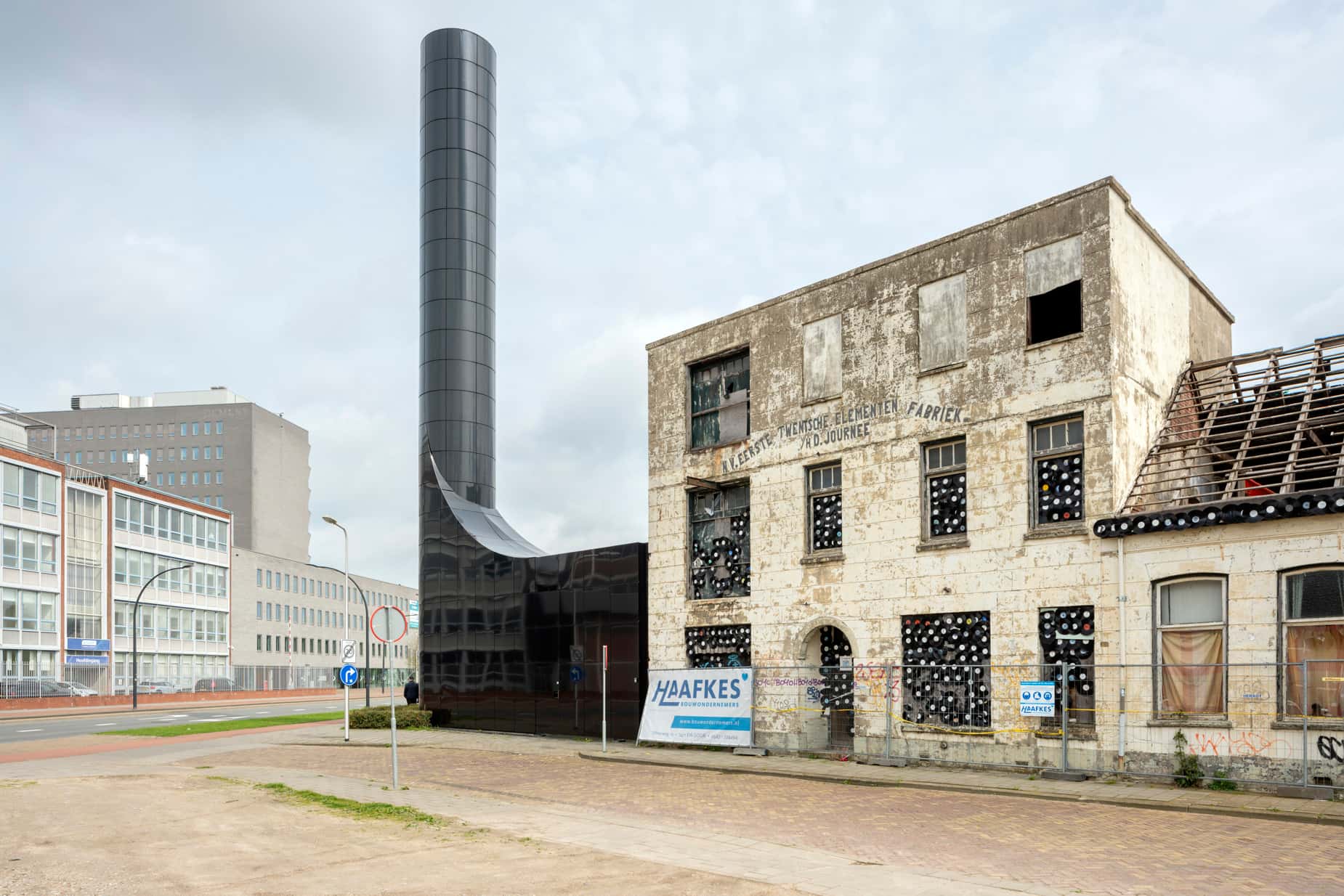 De Decentrale Energiecentrale aan de Laan van Zuid (MOPET architecten) met links een deel van het verlaten industriecomplex van Stork.