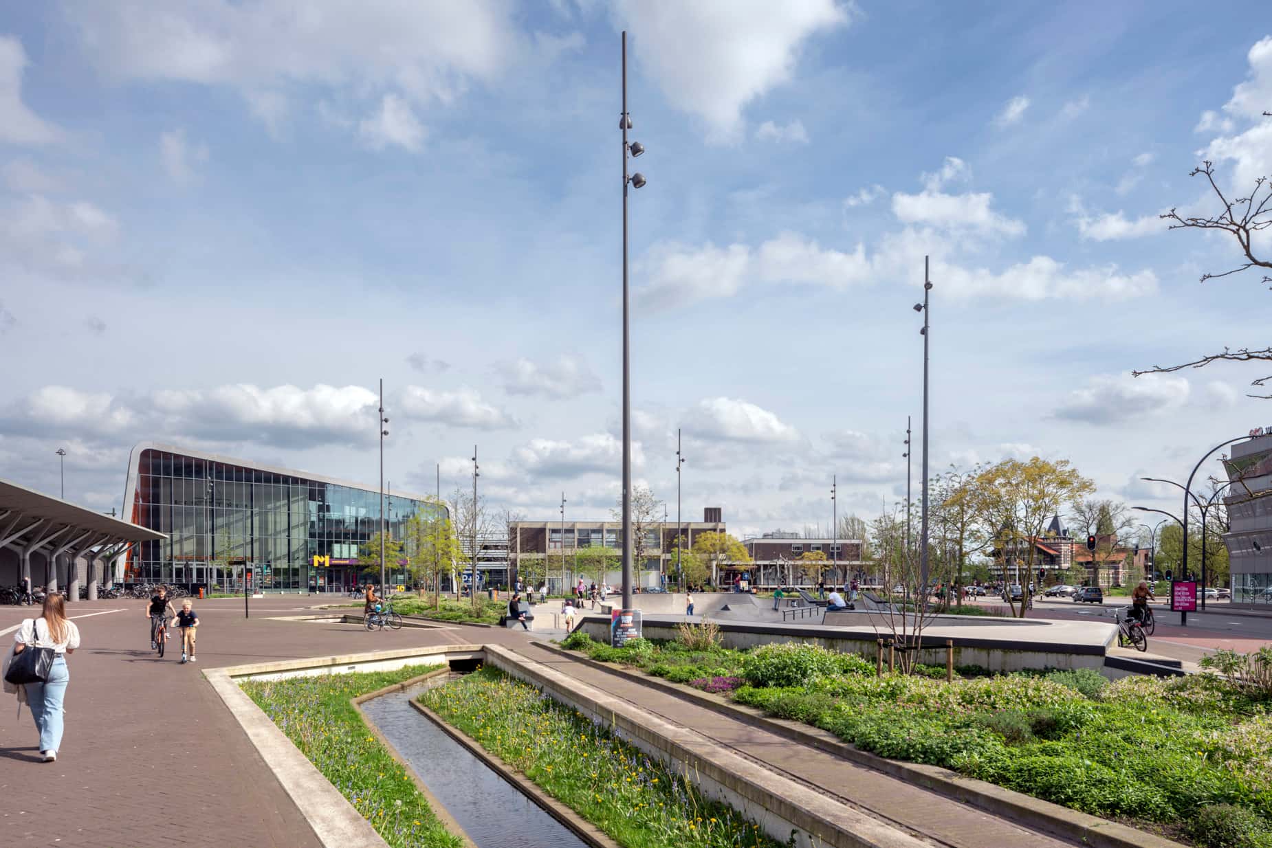 Industrieplein bij het station met herstelde Veldbeek (ontwerp bureau Lubbers). De skatebaan is ontworpen door Marco Matic.