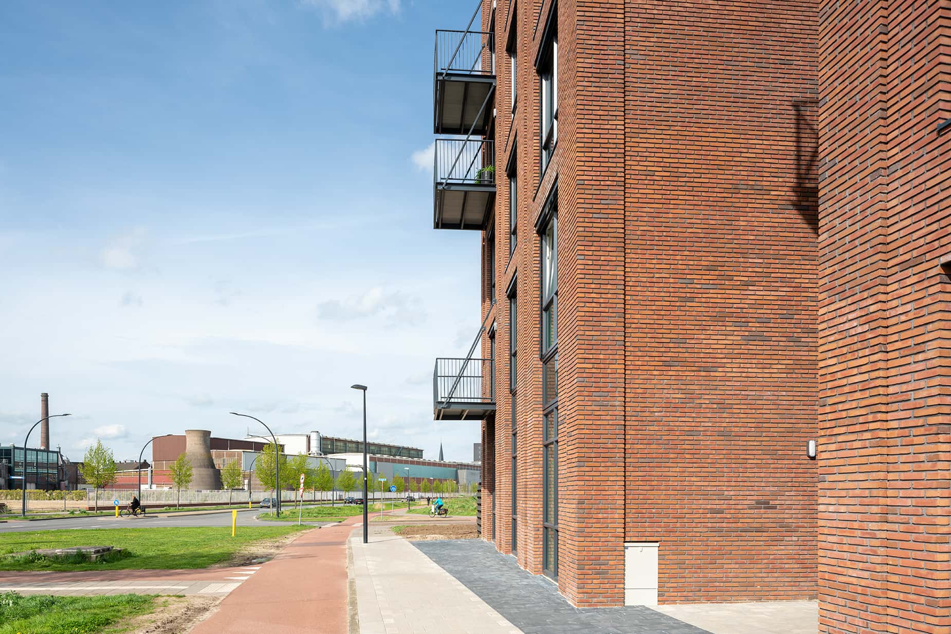Nieuwbouw (4D architecten) aan De Laan van Zuid met op de achtergrond de koeltorens van het Storkcomplex.