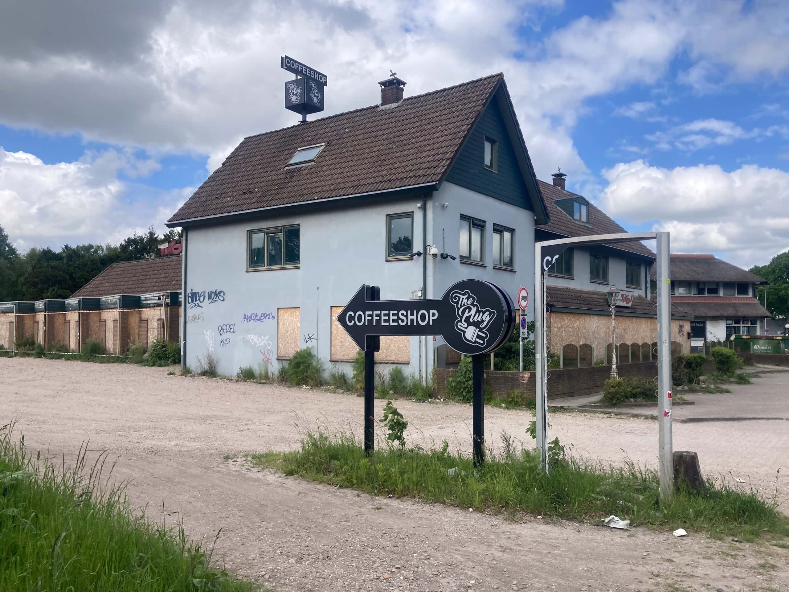 “Vroeger zaten hier twee wegrestaurants waar touringcarbussen bejaarden afzetten voor de lunch, het ene heette Schep, het andere De Struik.” Richters vertelt hoe de klad in dat soort recreatie kwam en hoe eind jaren negentig bovendien de gemeentegrens wat werd opgeschoven om Amersfoort de ruimte te bieden om te groeien: de wijk Vathorst moest worden gebouwd, ook was ruimte nodig voor bedrijven. “Ineens lagen deze gebouwen in Amersfoort en toen de stad een locatie zocht voor een coffeeshop, lag dit natuurlijk lekker uit het zicht. Maar voor veel inwoners van Hoevelaken is dit juist de entree van hun dorp, dus die zijn daar helemaal niet blij mee.”