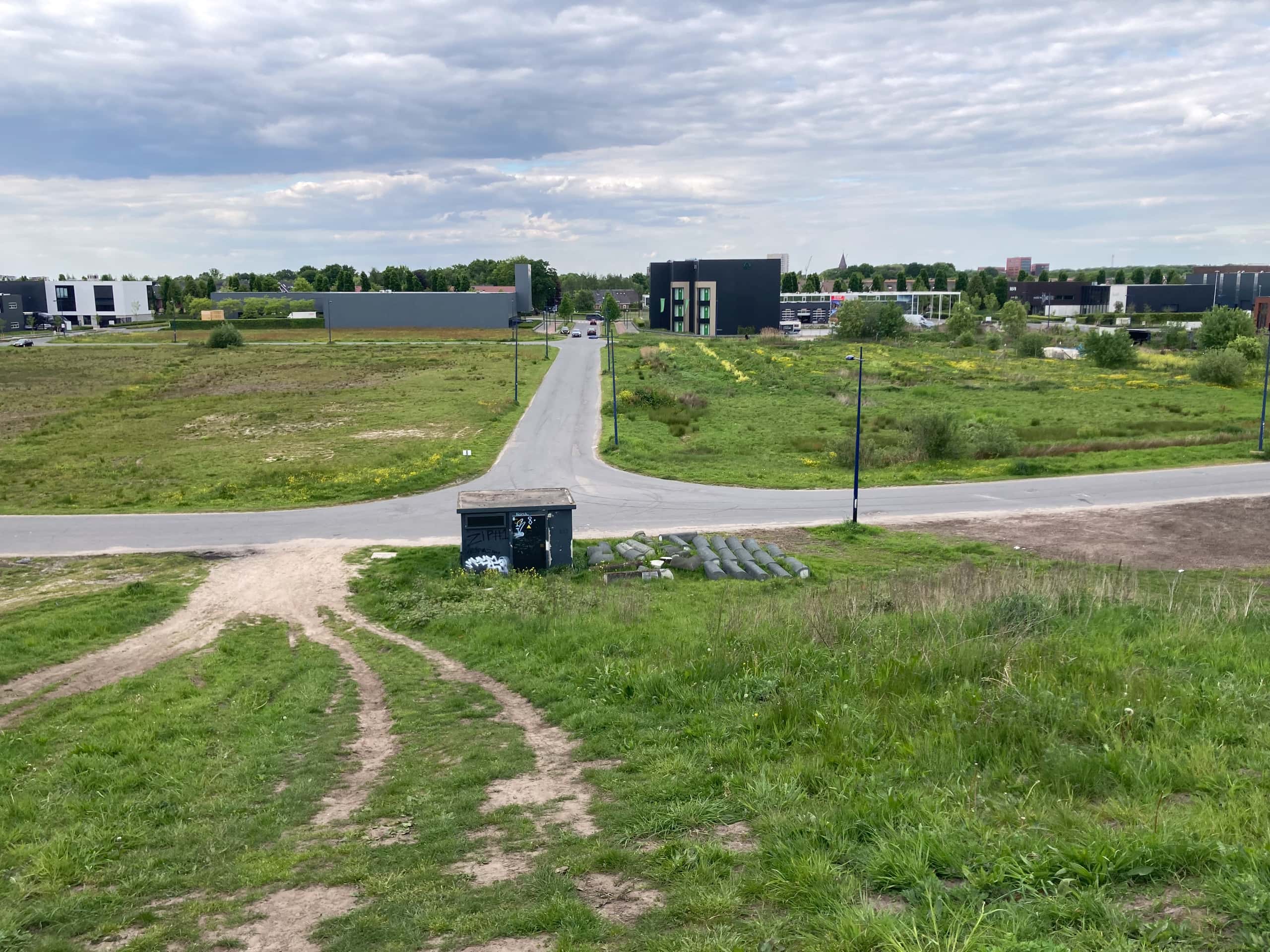 Ik wilde eigenlijk over de Nijkerkerstraat teruglopen naar de coffeeshop, maar Richters wil graag zo strak mogelijk tegen het klaverblad aan blijven lopen, “want daar ben ik nog nooit geweest.” We klauteren dus over het vooralsnog nutteloze deel van de tunnel en lopen achter het gronddepot van de gemeente Amersfoort langs, dat in het ontwerp tracébesluit bedoeld was als bouwhub voor de nieuwe knoop.