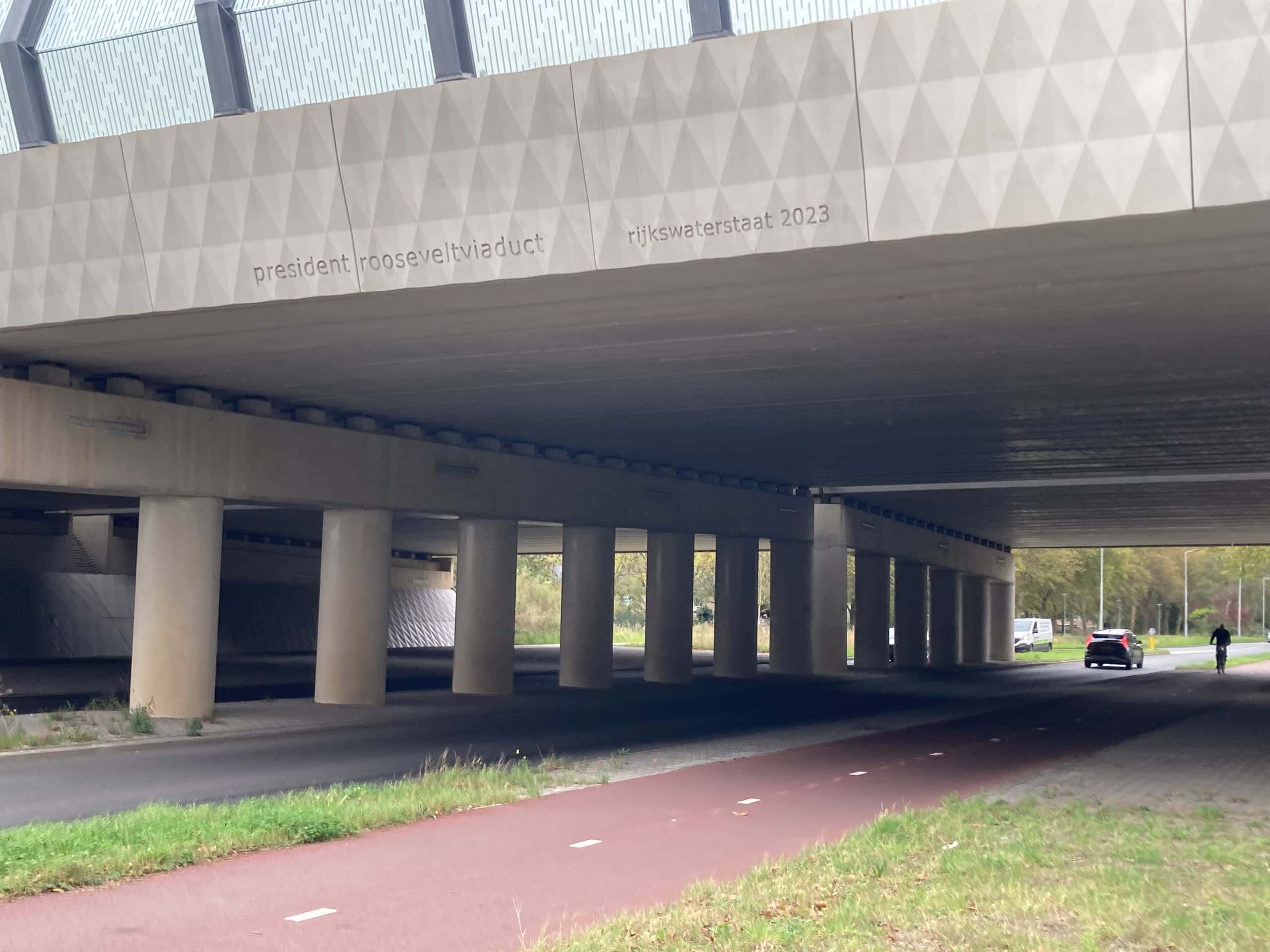 We lopen onder de verlengde A16 door via het President Rooseveltviaduct. Dit viaduct is vormgegeven in de huisstijl-met-ruitjes van De Groene Boog en dat aan weerszijden niet alleen is voorzien van een tweerichtingsfietspad en een trottoir, maar ook van een ecologische verbindingsstrip met grasstenen en vleermuisvriendelijke verlichting.