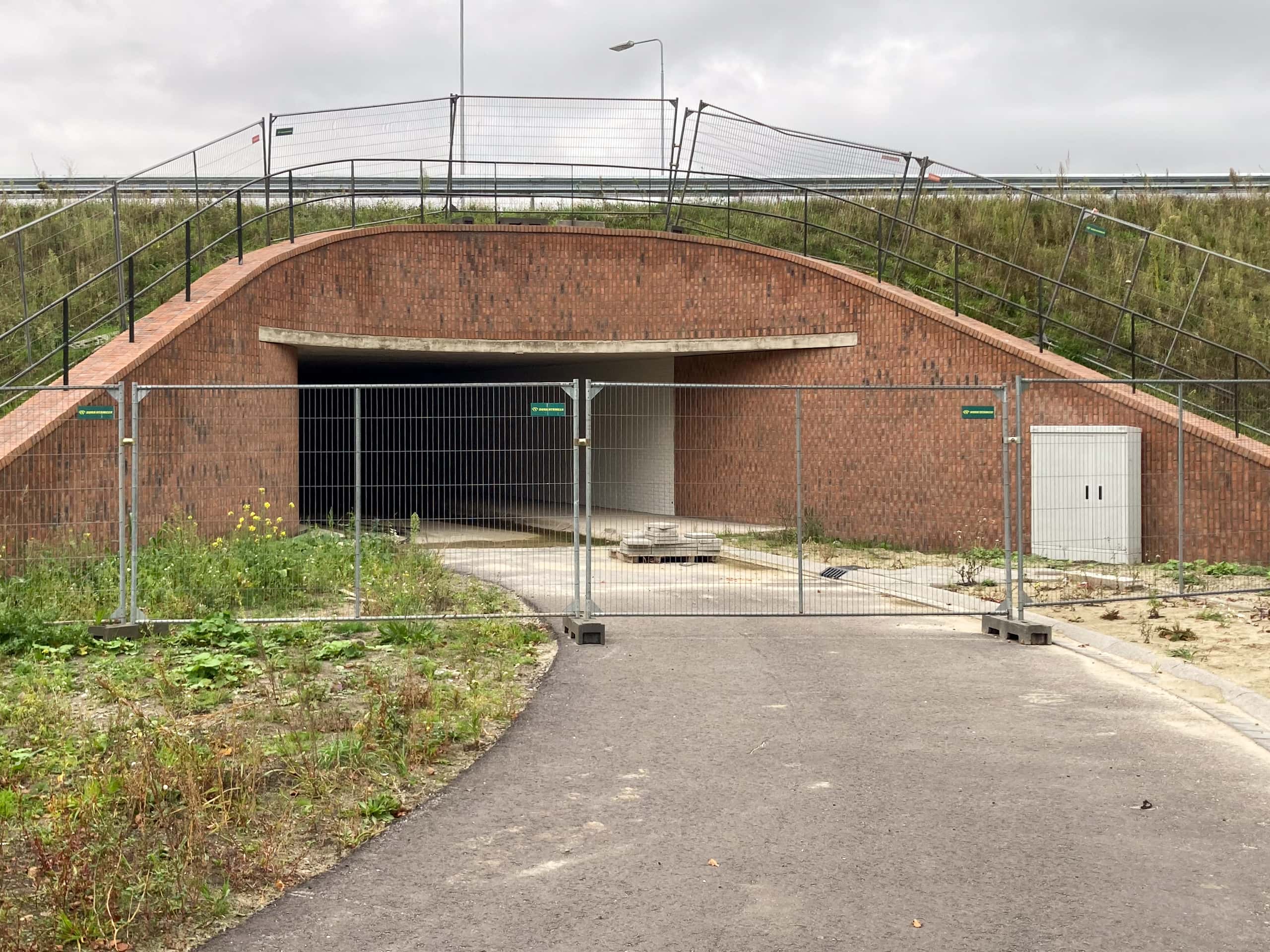 Een week voor onze wandeling, in oktober 2025, is de knoop officieel geopend. Klaassen is al door de tunnel onder de Rotte gereden – “Prachtig!” –, maar dat wil niet zeggen dat alles klaar is. De oksel van de op- en afrit voor onze neus ligt nog vol zandbergen. Tussen de oprit en keurig opgestapelde sloopauto’s loopt een weggetje, het is vers geasfalteerd. Na een paar honderd meter maakt het een scherpe bocht naar links en dan staan we voor een mooi gemetseld viaduct dat onder de op- en afrit doorvoert. Nu staat er nog een bouwhek, maar straks voert het weggetje terug naar de Hoofdweg. Klaassen, een beetje verbluft: “Ik herken deze onderdoorgang van het fietspad dat onder en door het knooppunt bij de Van Brienenoordbrug loopt. Je moet daar heel consequent de bordjes volgen anders verdwaal je. Zo krult dat fietspad.”