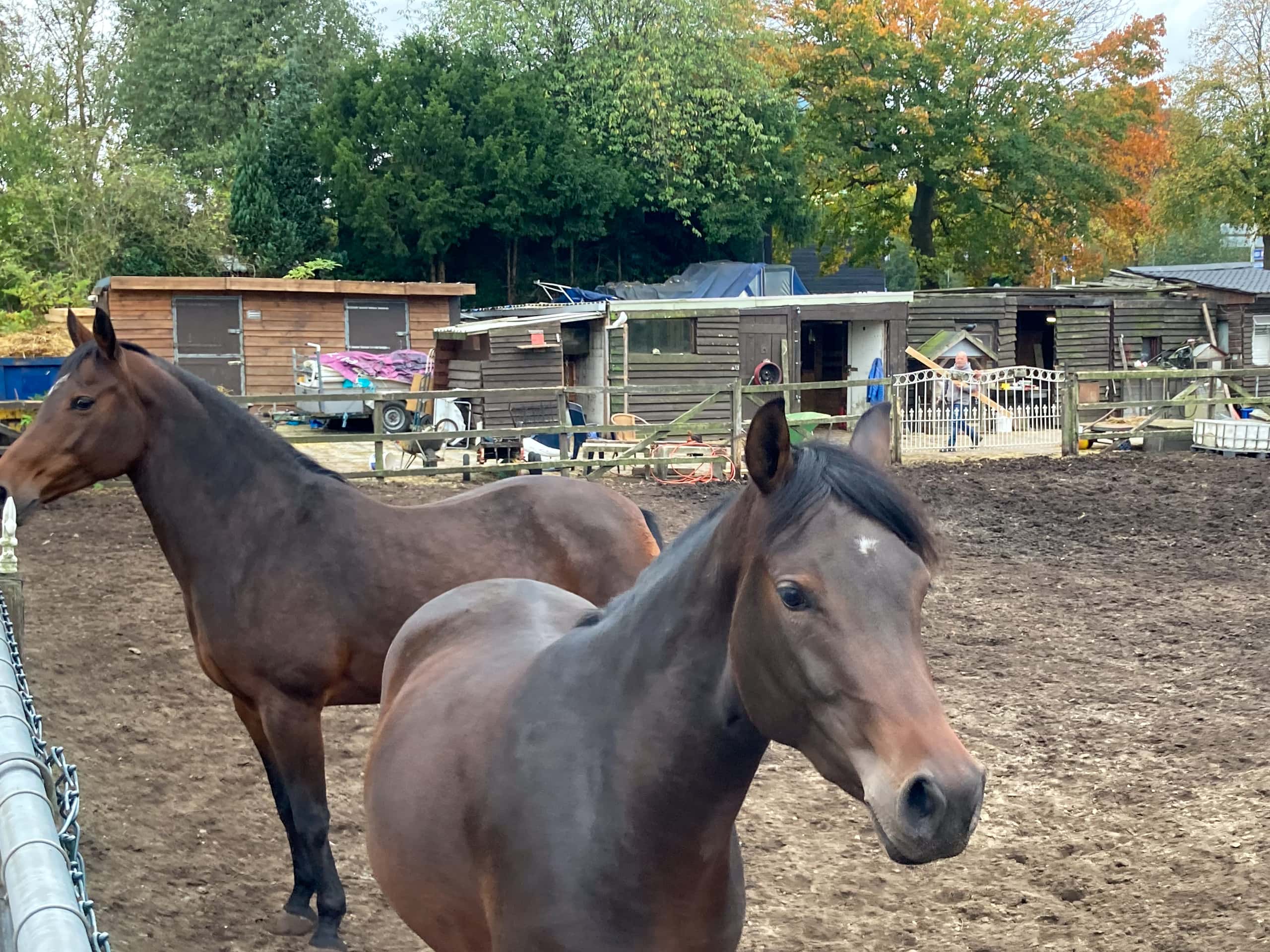 Aan de andere kant van de A16 lopen we een stukje over een oud fragment van de Hoofdweg met een rijtje panden uit de jaren twintig. Daarna slaan we rechtsaf langs een paardenweide en komen zo bij het punt waar straks het herstelde fietspad uit zal komen. Meteen naar rechts en we lopen een klein kampje op dat zich in de oksel van de knoop heeft genesteld.