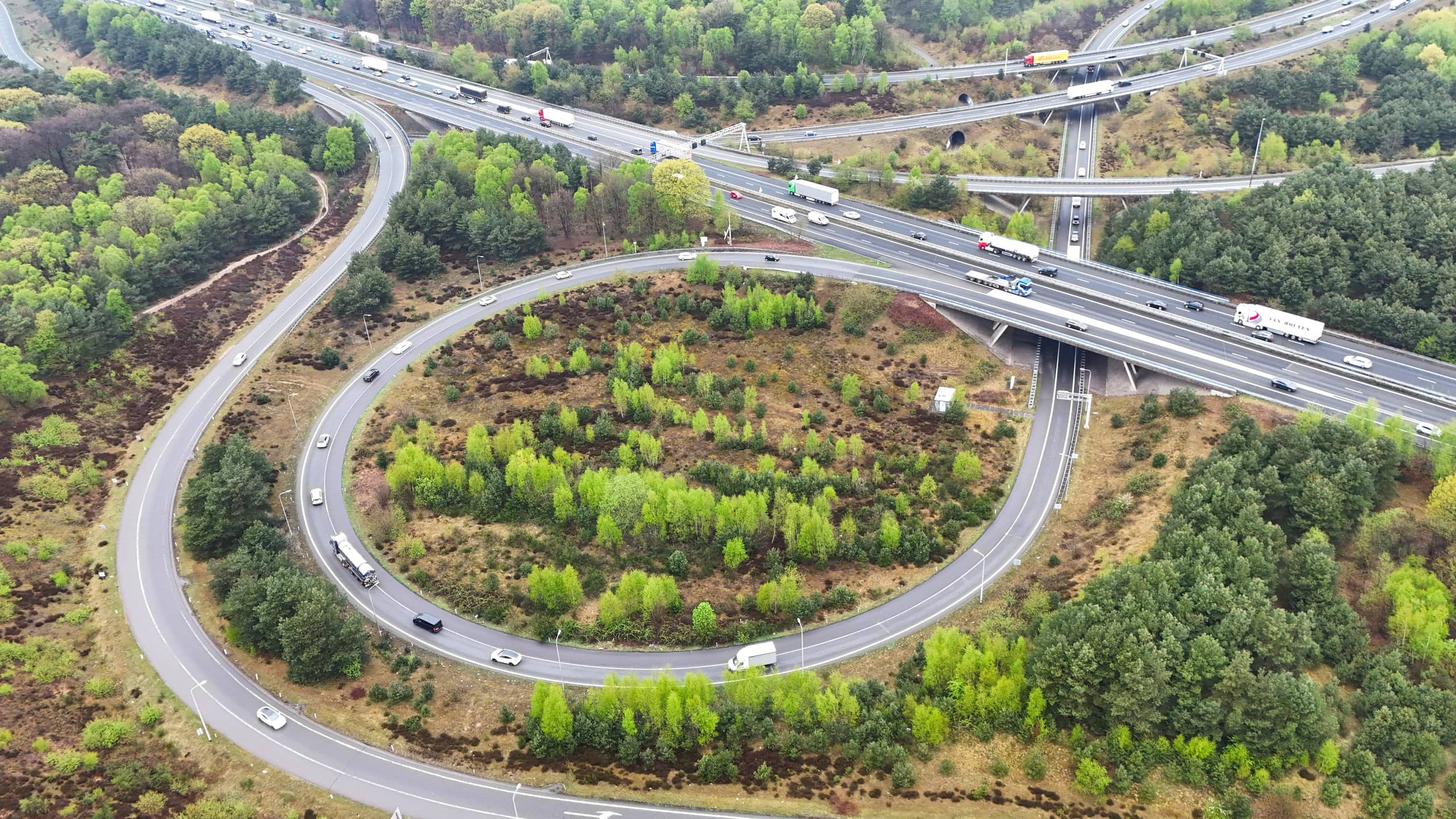 Het duizelt me, dus ik vraag maar snel of de lieflijke plas in de oksel daar altijd al lag. "Dat ven is al voor de aanleg van de knoop gegraven en vervolgens uitgediept en vergroot om de biodiversiteit te verhogen. Na de grote bosbrand op de Koningsheide heeft het ven ook de functie als blusvijver gekregen." Soms blijkt een natuurlijke inpassing zich dus spontaan aan te dienen.