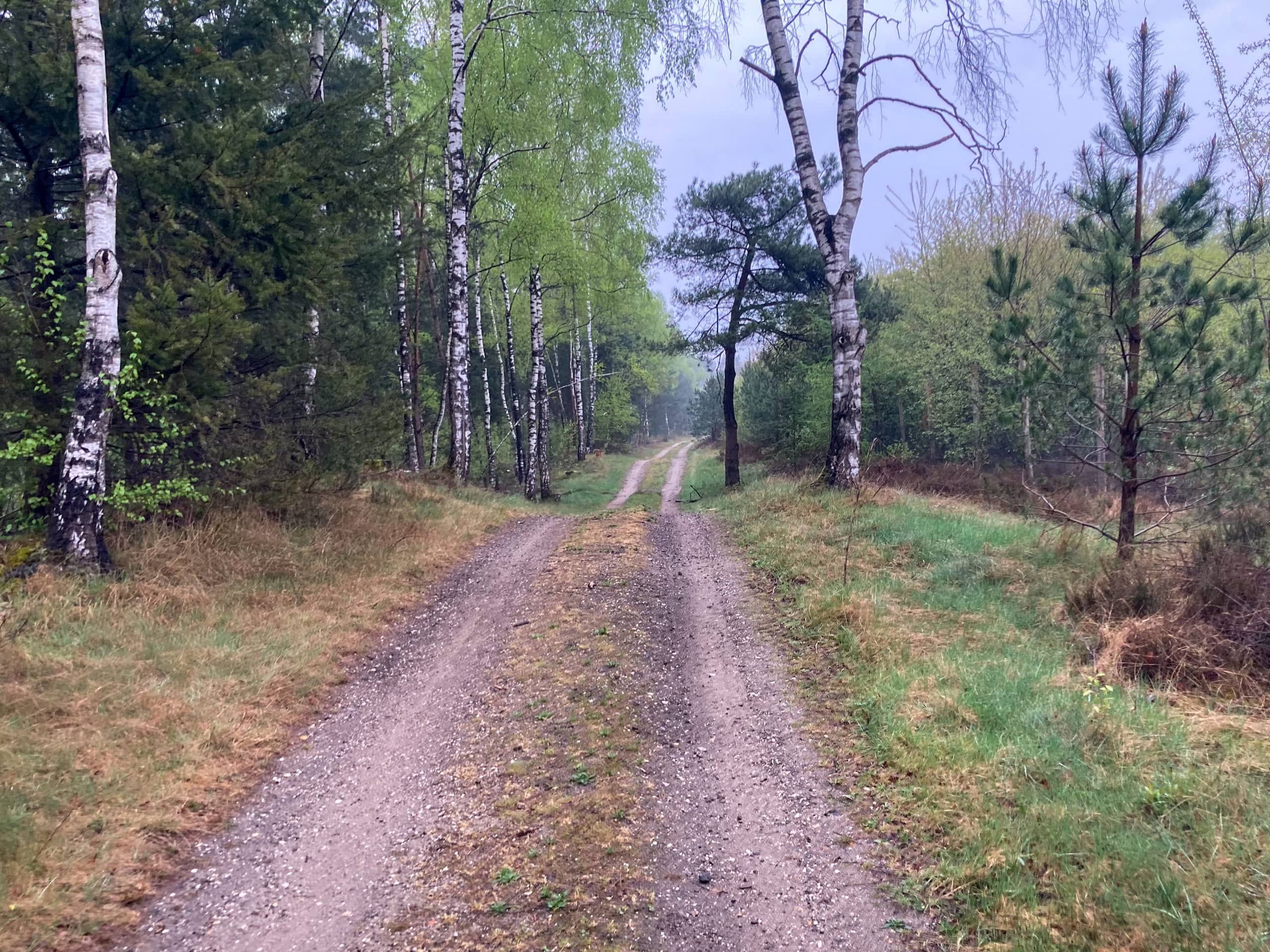 Bij het paardenhek staat een door de gemeente gesanctioneerde picknicktafel, maar we stoppen niet en lopen door een lichte miezerregen verder over een lange, rechte zandweg naar het noorden. Aan onze linkerhand bossen en de Koningsheide, rechts de A50.