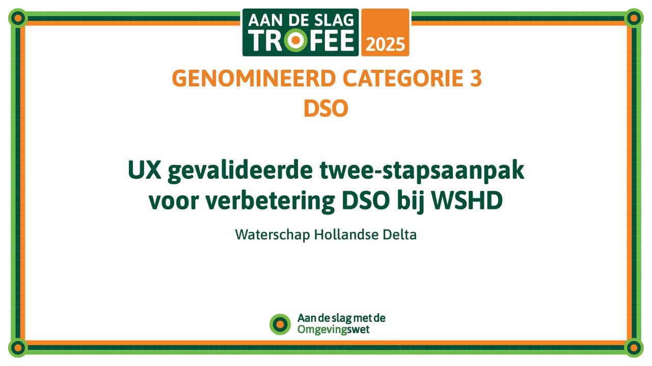 De pilot bij het Waterschap Hollandse Delta is de eerste stap. Bij succes kunnen we dat eenvoudig uitrollen en opschalen bij alle waterschappen en gemeentes, zodat overal de vergunningverlening efficiënt en gebruiksvriendelijk wordt in de DSO. Doe je met ons mee? Stem op ons!
